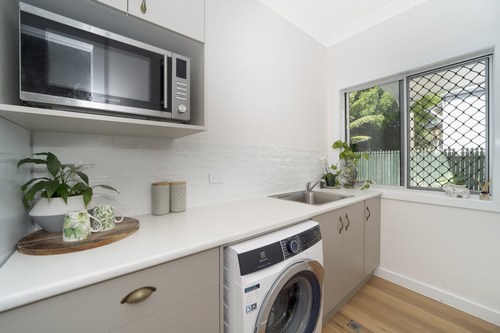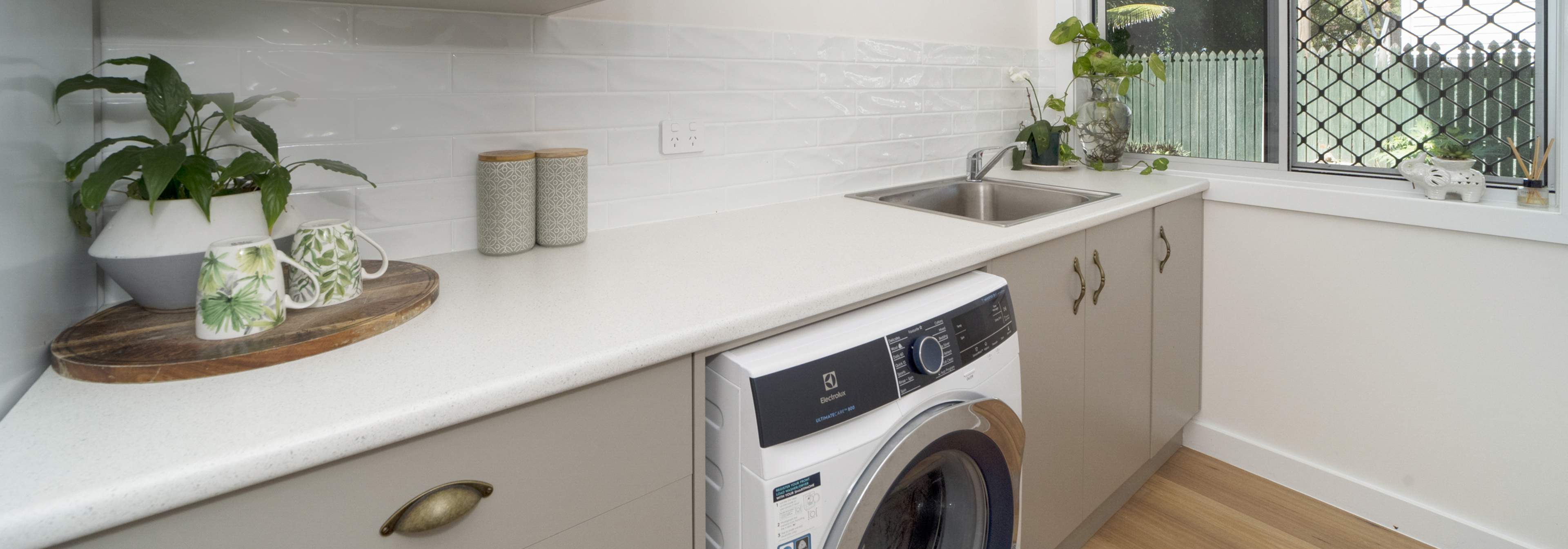 Utilising Stone Ambassador benchtop, melamine doors and panels, teamed with antique bronze handles.