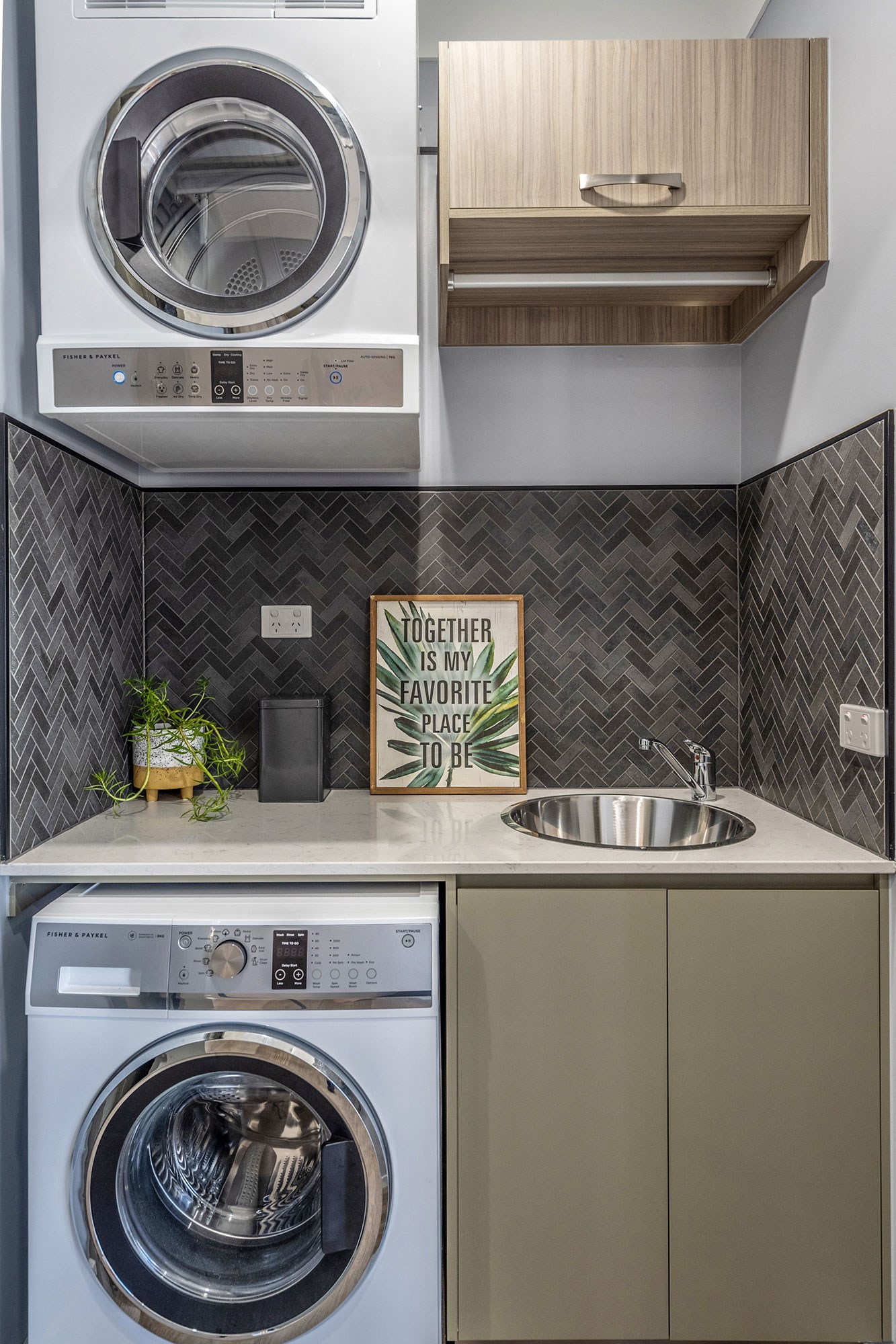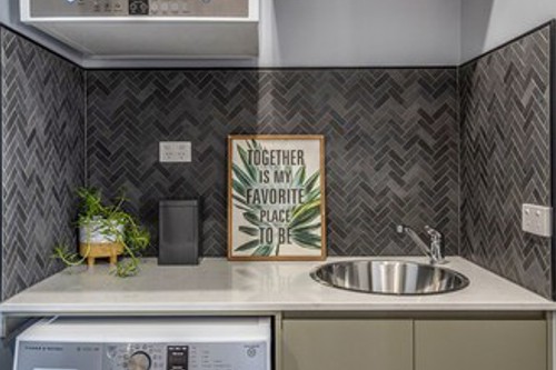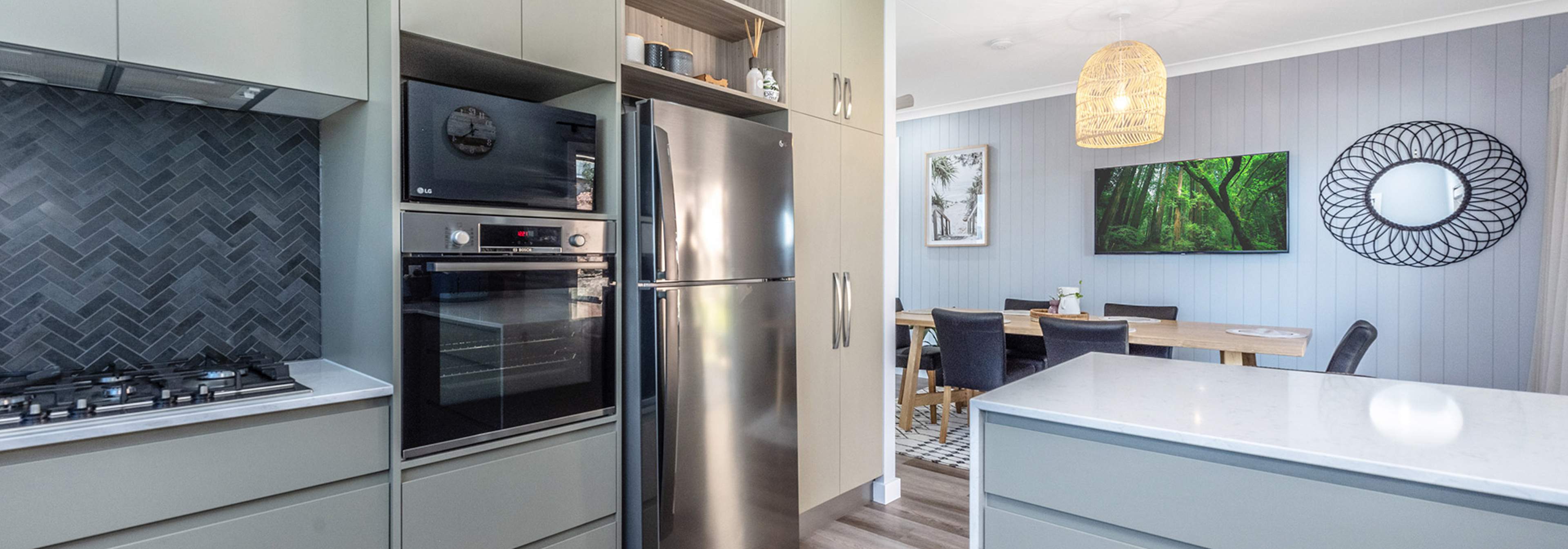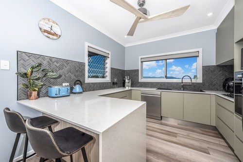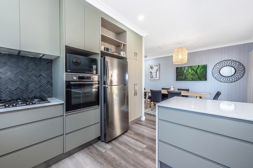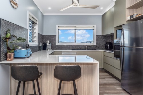 Stone Ambassador benchtops teamed with shark nose finger pull melamine doors and wood accents.
