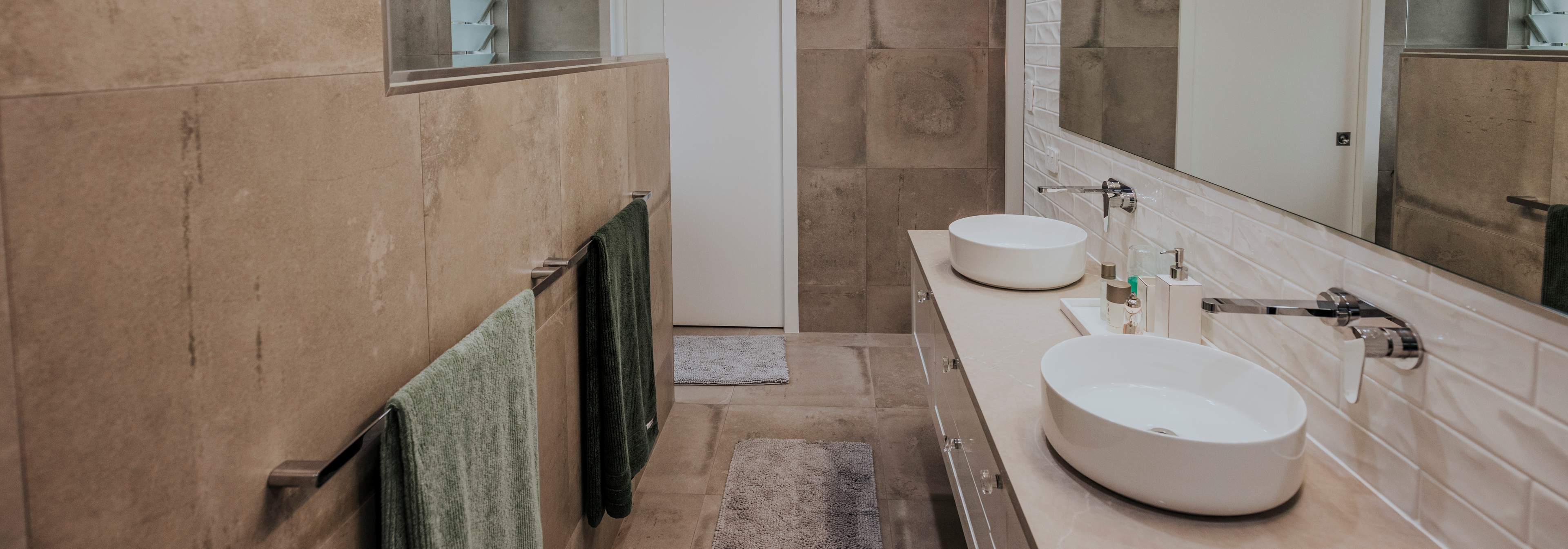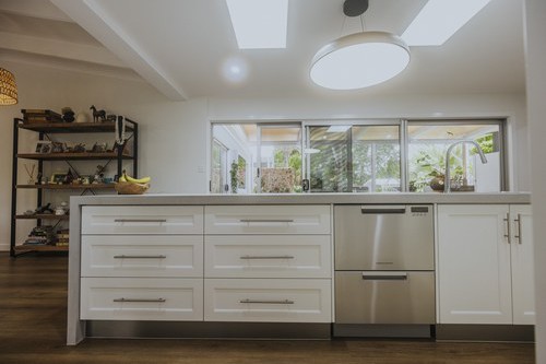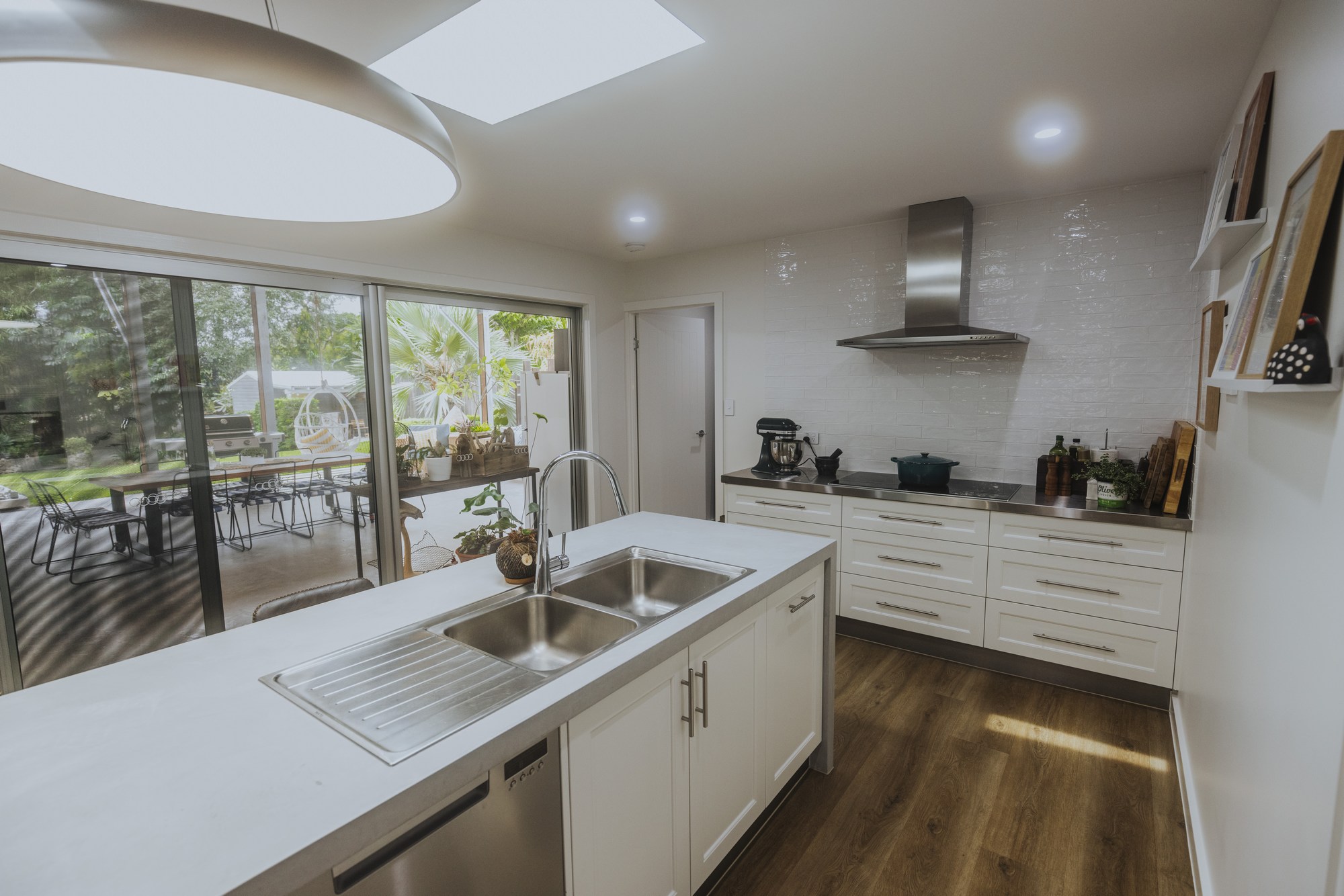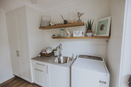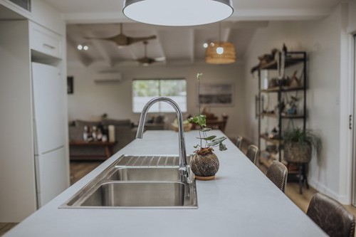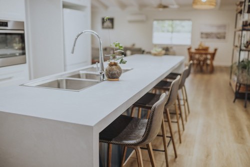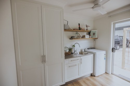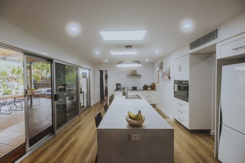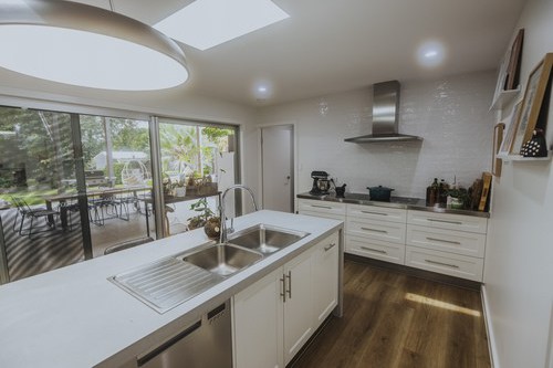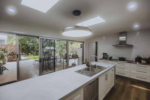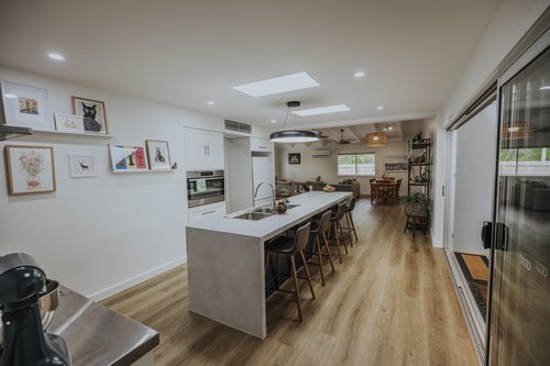A stunning renovation. Interesting use of different materials were used in the creation of this job. Two pack painted island, incorporating concrete and stainless steel benchtops in the kitchen and Stone Ambassador to the vanities and laundry.