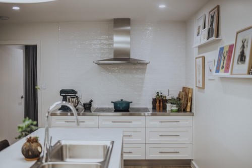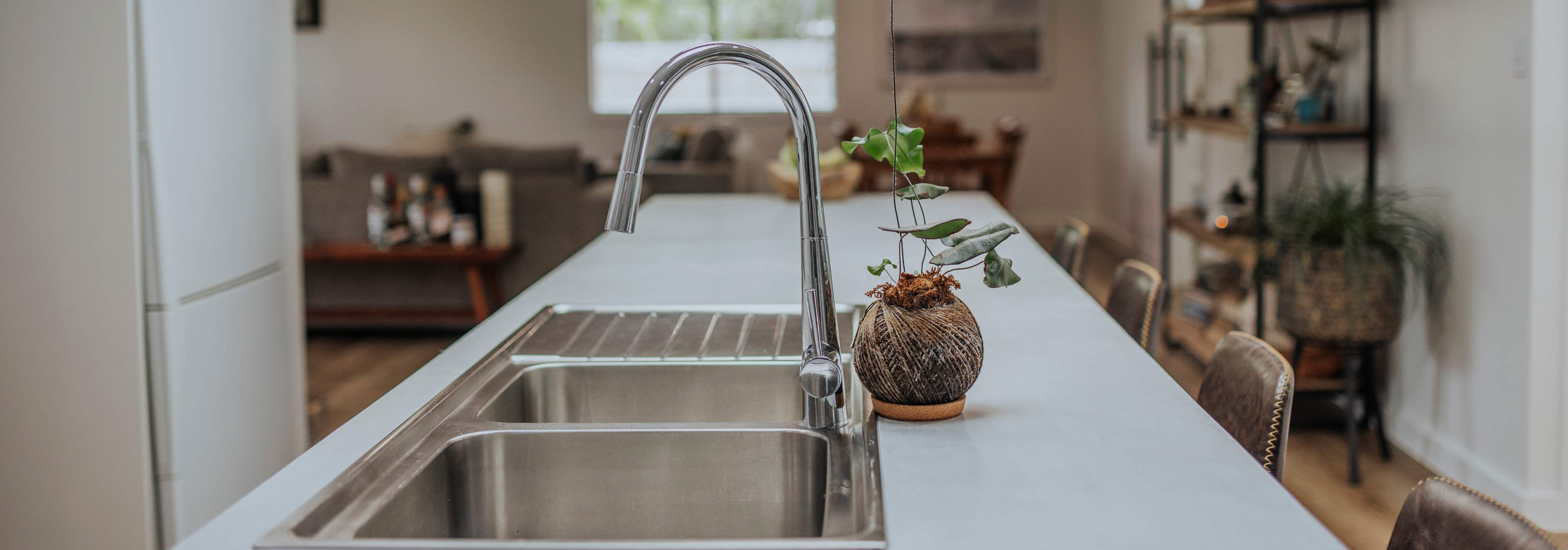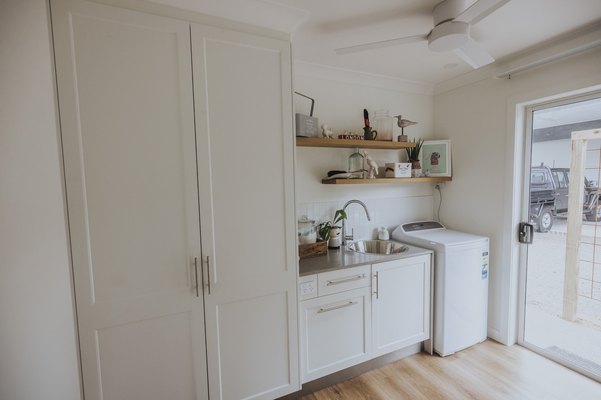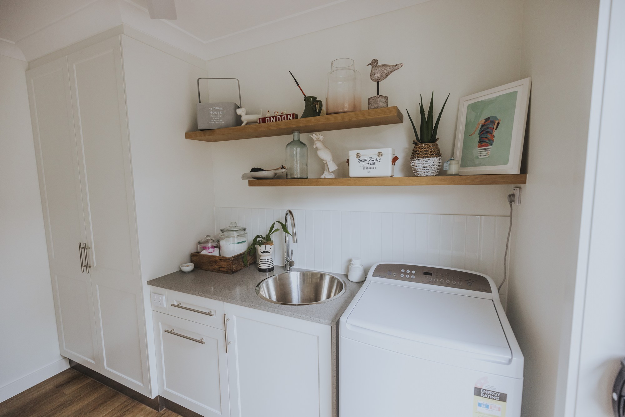 A stunning renovation. Interesting use of different materials were used in the creation of this job. Two pack painted island, incorporating concrete and stainless steel benchtops in the kitchen and Stone Ambassador to the vanities and laundry.